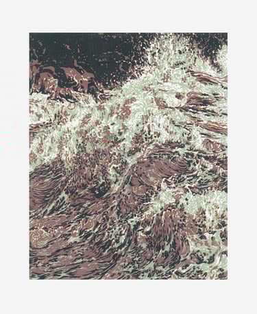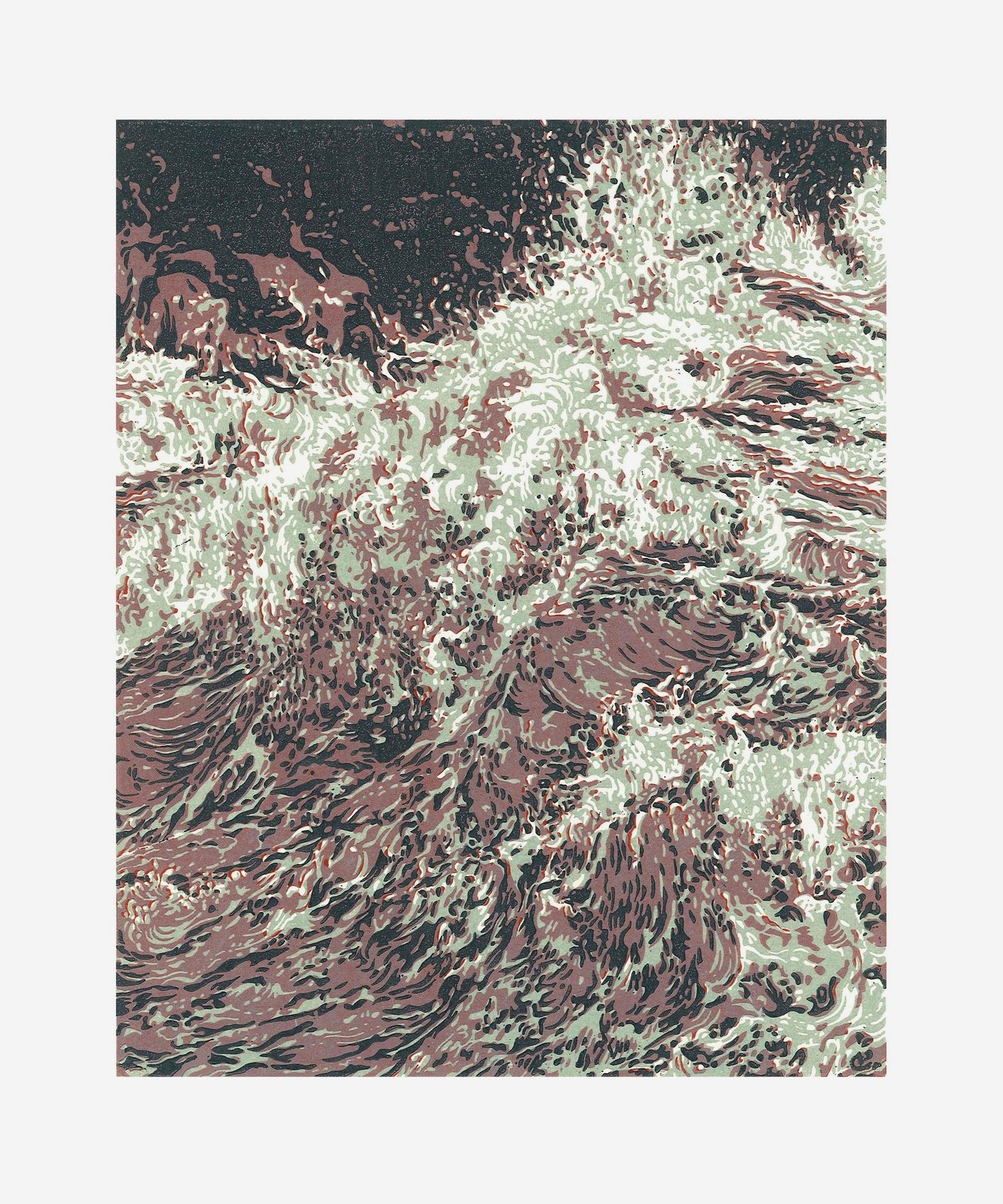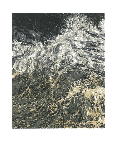 La série des Vagues (linogravures polychromes) est associée à la série des Déferlantes (linogravures monochromes). Le travail créatif est axé sur une thématique récurrente : celle de l’expression de la dynamique des flux naturels, des turbulences, des états métastables perceptibles dans la nature (entre chaos et équilibre). Une plongée graphique.